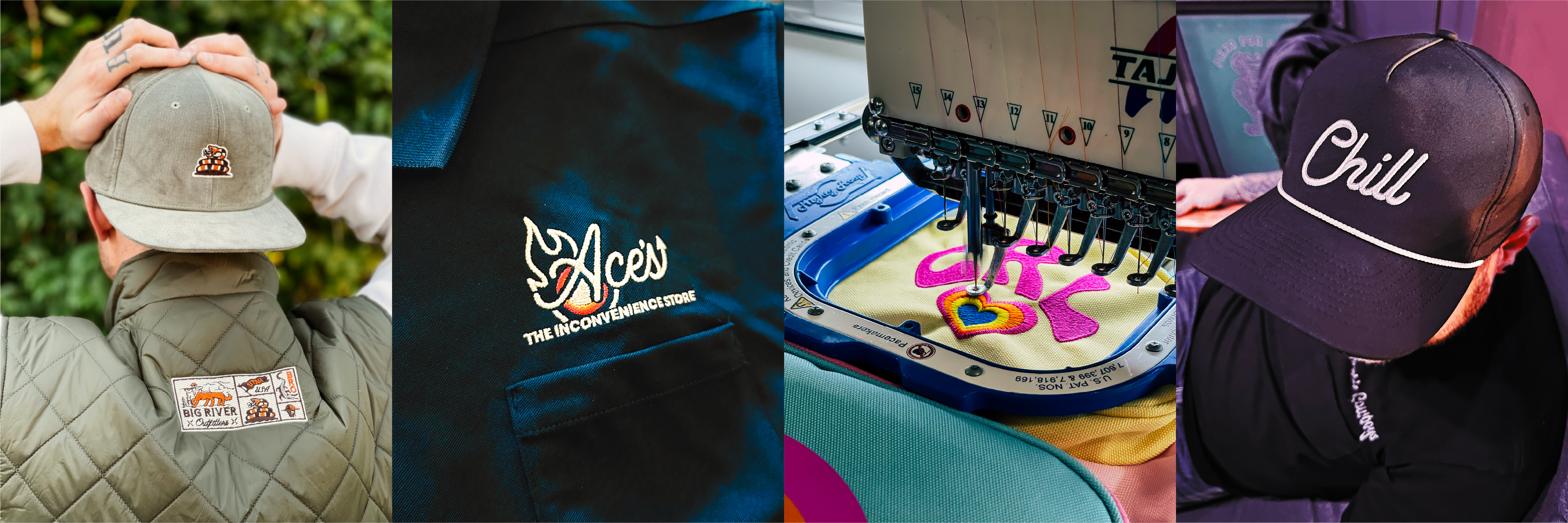 Puff embroidery is a specialized technique that adds a three-dimensional, raised effect to designs on garments and accessories. The art, once digitized, is sewn over a layer of foam into the garment or accessory. Puff embroidery is a reliable way to make your art pop!